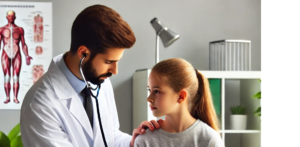 DALLE 2025-02-05 214939 – A doctor in a white coat examining an 11-year-old girl in a medical office The doctor is using a stethoscope to listen to the girls heartbeat The g
